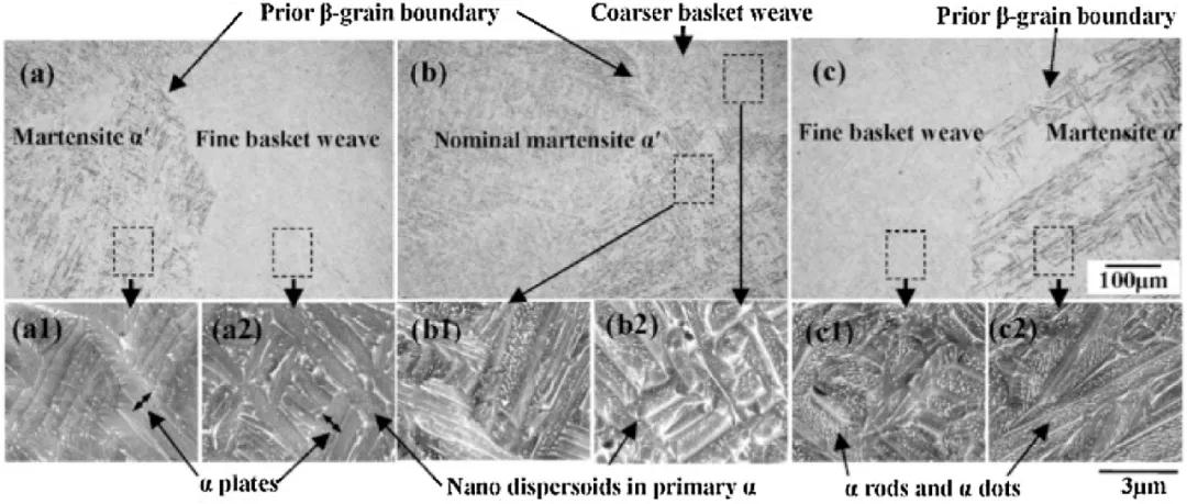 人們普遍認(rèn)為,產(chǎn)品的微觀結(jié)構(gòu)取決于其在制造過(guò)程中的熱歷史。獨(dú)特的WAAM熱循環(huán),包括反復(fù)加熱和冷卻,在加工零件中產(chǎn)生亞穩(wěn)定的微觀結(jié)構(gòu)和不均勻成分。例如,Baufeld等人研究了使用基于gtaw的WAAM系統(tǒng)制備的Ti6Al4V的微觀結(jié)構(gòu),發(fā)現(xiàn)在預(yù)制墻體上有兩個(gè)不同的區(qū)域。在垂直于構(gòu)建方向的底部區(qū)域,出現(xiàn)了帶α相片層的籃波Widmanst?tten結(jié)構(gòu),而在頂部區(qū)域,沒有帶層,主要是針狀的沉淀結(jié)構(gòu)。在po基過(guò)程中也觀察到類似的微觀結(jié)構(gòu)演變。Lin等報(bào)道了沿build方向的漸變組織,并從底部到頂部識(shí)別出馬氏體α′結(jié)構(gòu)、Widmanst?tten結(jié)構(gòu)和籃波結(jié)構(gòu),如圖所示。由于熱梯度的影響,在構(gòu)建方向上還觀察到具有離散方向的β晶粒的外延生長(zhǎng),這在增材制造的鈦合金部件中很常見。