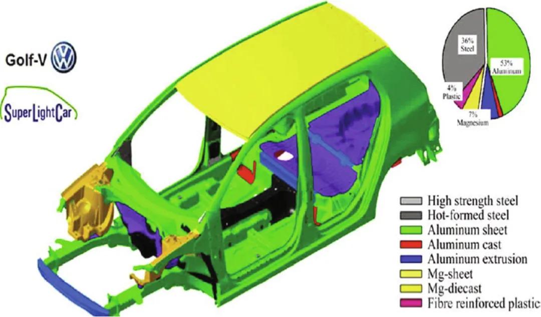 汽車工業(yè)中鋁及其合金的發(fā)展已用于車輪、變速器、發(fā)動(dòng)機(jī)和熱交換器的鑄造。最特別的減重范圍是白色車身(白車身)和大量鋁(圖4)。