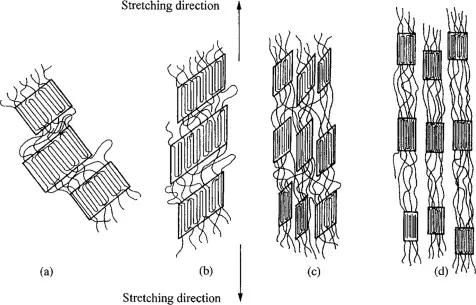 如圖,用x射線衍射、光學(xué)顯微鏡和電子顯微鏡詳細(xì)分析了半晶聚合物塑性變形的機(jī)理。特別是對(duì)聚乙烯單軸變形的情況進(jìn)行了研究。這種處理僅限于分析由非晶區(qū)連接的球晶的三個(gè)相鄰晶片的修飾。