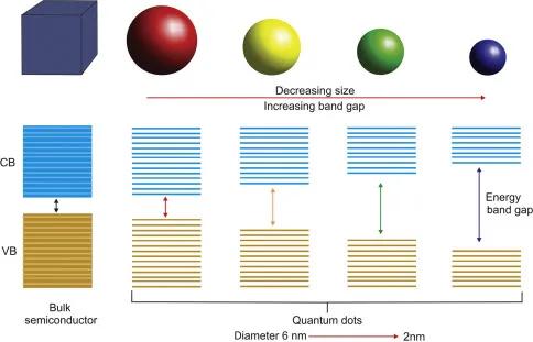 量子點(diǎn)的電子特性介于塊狀半導(dǎo)體和孤立分子。光電特性是由它們的大小和形狀決定的,并隨著這些變量的變化而變化。例如,當(dāng)量子點(diǎn)被一個能量光子hν(其中,ν是入射光子的頻率)激發(fā)時,那些相對較大的尺寸,在大約5-6納米,發(fā)射橙色或紅色波長的能量。較小的量子點(diǎn)發(fā)射出藍(lán)色或綠色范圍內(nèi)較短的波長。因此,可以通過改變網(wǎng)點(diǎn)大小和形狀來調(diào)整這些屬性以獲得所需的輸出。圖3.3顯示了量子點(diǎn)的帶隙隨尺寸變化的變化情況。量子點(diǎn)可以由單元素材料(如硅或鍺)或化合物半導(dǎo)體(如CdSe、PbSe、CdTe和PbS)制成。量子點(diǎn)有時也被稱為“人工原子”,因?yàn)檫@些材料表現(xiàn)出在原子和分子中可見的離散電子態(tài)。