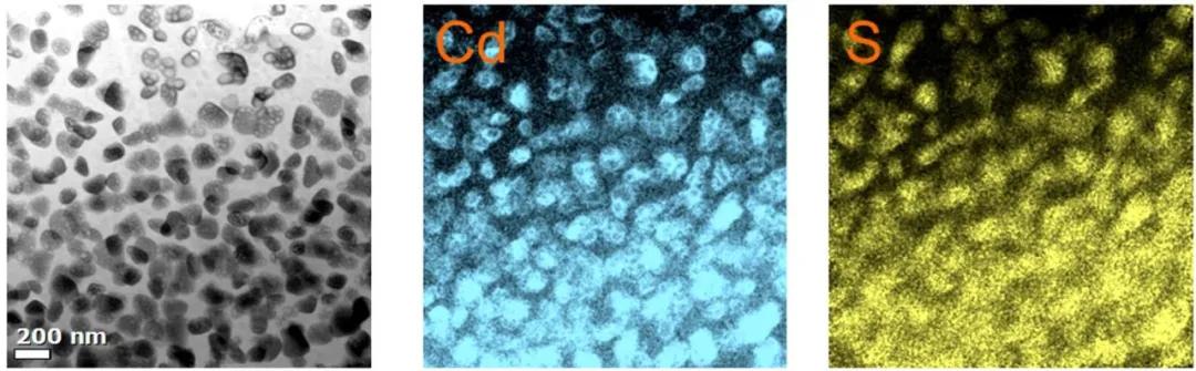 TEM圖像(圖2d)顯示初始玻璃中沒有納米晶體,而在激光照射的微區(qū)中檢測到不同尺寸的納米晶體(圖2(e-h))。在激光寫入疇中心發(fā)現(xiàn)了最大尺寸達(dá)340nm的分散納米晶體。EELS圖譜明顯顯示沉淀的納米晶體由Cd和S組成(圖3)。