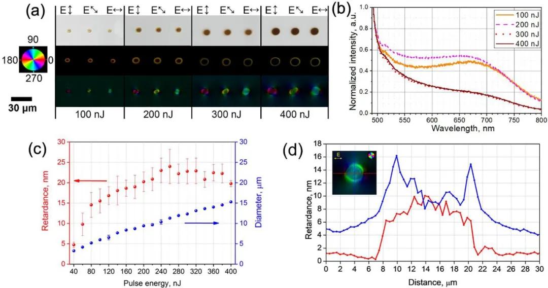 圖1顯示了用不同激光偏振寫入的微疇激光的光學(xué)特性結(jié)果。將激光寫入的微疇與在1 MHz脈沖重復(fù)頻率下獲得的微疇進(jìn)行比較[8]可以看出,微疇周圍沒有明顯的透明玻璃熔化區(qū),并且在100 kHz重復(fù)頻率下,微疇的黃色到棕色更為明顯。這歸因于100 kHz時的“溫和”蓄熱模式,在該模式下,熱量以較小的程度向外散發(fā),并提供較小尺寸的微疇,證實(shí)激光寫入強(qiáng)烈依賴于應(yīng)用的脈沖重復(fù)率。從發(fā)射信號最大的微疇邊緣獲得的發(fā)光光譜(圖1b)分別由間隙硫或鎘空位和CdS表面硫空位固有的綠色和紅色成分組成[10]。將脈沖能量從100 nJ增加到400 nJ導(dǎo)致微疇直徑從5.5μm增加到15μm,并導(dǎo)致發(fā)光減弱(圖1(a-c))。相反,脈沖能量越高,微疇中可達(dá)到的最大延遲水平越高。可能是由于激光誘導(dǎo)應(yīng)力,其分布取決于激光偏振(圖1(a,d)),因此在激光寫入的微疇邊緣處的延遲值較高。