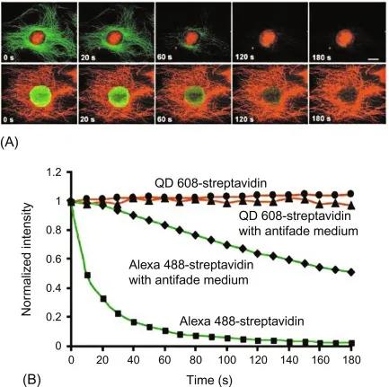 量子點(diǎn)和Alexa 488之間的光穩(wěn)定性比較。(A)頂行:在3T3細(xì)胞中,用QD 630鏈霉親和素(紅色)標(biāo)記核抗原,同時用結(jié)合抗鼠IgG(綠色)的Alexa 488標(biāo)記微管。底層:微管用QD 630鏈霉親和素(紅色)標(biāo)記,核抗原用與抗人IgG結(jié)合的Alexa 488染色為綠色。在100×1.30油浸物鏡下,用100 W汞燈連續(xù)照亮試樣3分鐘。使用激發(fā)濾波器(ex 485±20 nm)激發(fā)Alexa 488和QD 630。使用電動濾輪上的發(fā)射濾波器em 535±10 nm和em 635±10 nm分別采集Alexa 488和QD 630信號。每種顏色的圖像都是用冷卻的CCD相機(jī)以10秒的間隔自動拍攝的。顯示0、20、60、120和180秒時的圖像。Alexa 488的標(biāo)記信號迅速消失,在2分鐘內(nèi)無法檢測到,而QD 630的信號在整個3分鐘的光照期間沒有明顯變化。比例尺,10μm。(B)使用裝有甘油或antifade安裝介質(zhì)Vectashield的標(biāo)本,定量分析QD 608鏈霉親和素(染色微管)和Alexa 488鏈霉親和素(染色核抗原)強(qiáng)度的變化。圖像由X. Wu, H. Liu, J. Liu, K.N. Haley, J.A. Treadway, J.P. Larson, N.Ge, F. Peale, M.P. Bruchez,利用半導(dǎo)體量子點(diǎn)對癌癥標(biāo)記物Her2和其他細(xì)胞靶點(diǎn)進(jìn)行免疫熒光標(biāo)記,Nat. biotechno21(1)(2002) 41-46。