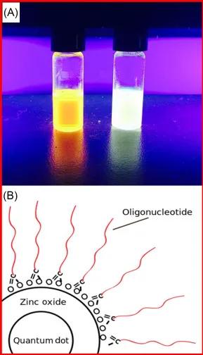 量子點(diǎn)。(A)在量子點(diǎn)溶液上激發(fā)紫外光時,發(fā)出不同顏色的光。(B)氧化鋅、羧基和寡核苷酸覆蓋在量子點(diǎn)表面,以促進(jìn)DNA結(jié)合。改編自Wikipedia, 2017:量子點(diǎn)的DNA功能化[Online]。(2018.1.5)https://en.wikipedia.org/wiki/DNA-functionalized_quantum_dots.