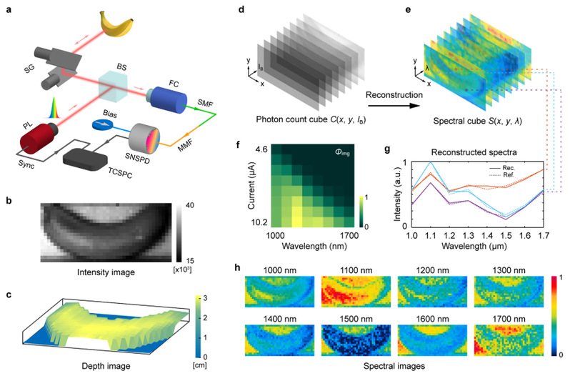 南京大學吳培亨院士團隊首次在兩者的結(jié)合上取得突破,他們利用超導納米線單光子探測器固有的非線性光譜調(diào)制特性,結(jié)合計算光譜儀方法,實現(xiàn)了單探測器光譜儀( single-detector spectrometer, SDS )。這是一種最簡化的光譜儀,擺脫了對光學分光器件的需求,通過編程探測器測量過程并結(jié)合計算重構(gòu)算法,就能夠?qū)θ肷涔庾V進行分辨。實驗演示了從 660nm 至 1900nm 的寬帶測量能力,并在通信波段實現(xiàn)了優(yōu)于 10nm 的光譜分辨率。同時,該團隊還將激光雷達同單探測器光譜儀結(jié)合,演示了多光譜激光雷達功能。