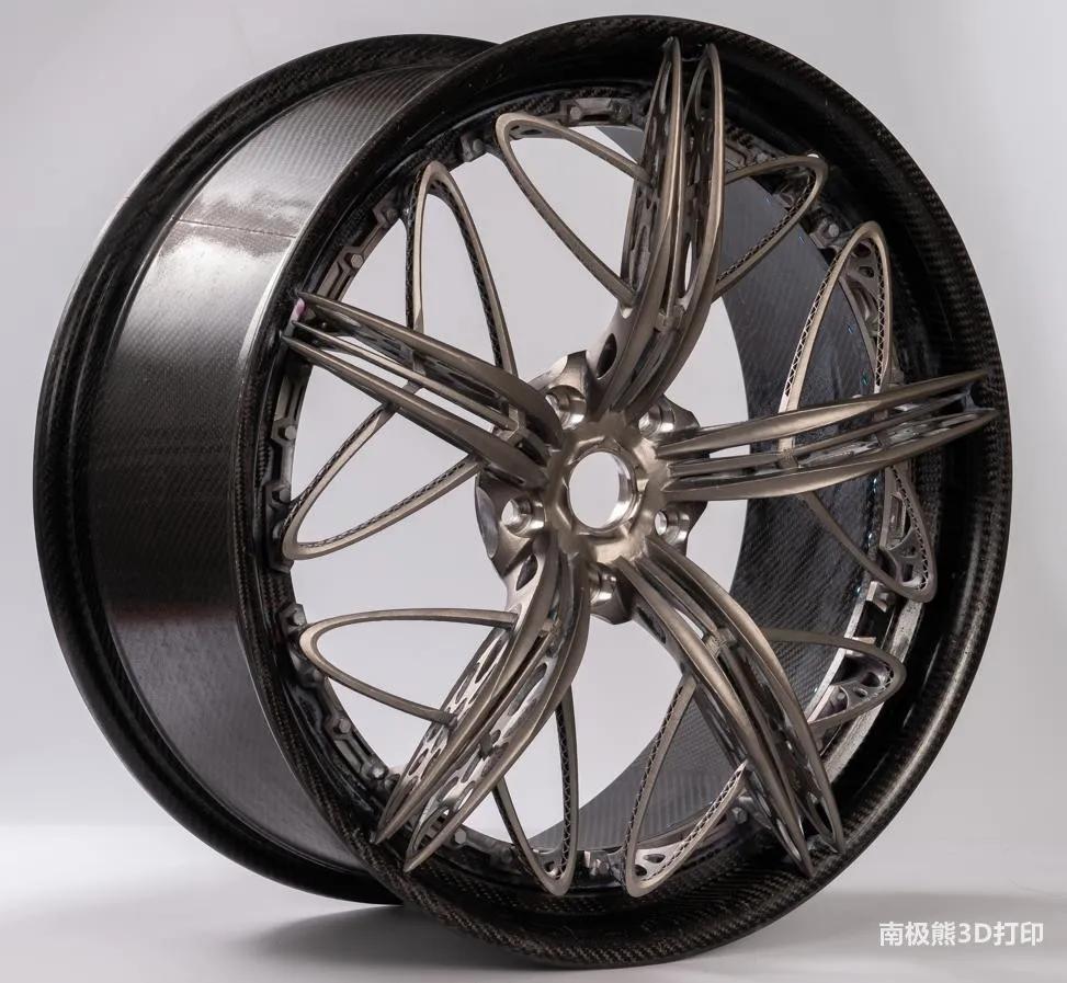 據(jù)了解,該輪轂規(guī)格為20寸,外圈由碳纖維材質(zhì),內(nèi)圈由鈦合金整體3D打?。ㄊ褂贸尚统叽缈蛇_(dá)600mm的鉑力特四激光大型SLM金屬3D打印機(jī))而成,打印部分直徑為500mm,單個(gè)輪轂重量為10kg,相比傳統(tǒng)輪轂重量減少40%,整體性能提高30%以上。據(jù)負(fù)責(zé)人介紹,相比于傳統(tǒng)制造方法,3D打印可實(shí)現(xiàn)輪轂的定制化,真正的滿足不同客戶的定制化需求,并且創(chuàng)造出傳統(tǒng)制造方式無(wú)法達(dá)到的酷炫造型。