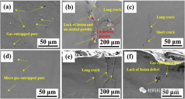 圖1 (a-c) CLMD和(d-f) EHLMD涂層典型冶金缺陷:氣孔、熔融缺陷和涂層中的裂紋。研究結(jié)果表明,EHLMD和CLMD都產(chǎn)生了與大部分激光增材制造技術(shù)類(lèi)似的缺陷,主要包括三種類(lèi)型:裂紋、氣孔和熔融缺陷。保護(hù)氣或者是粉末在熔化過(guò)程中產(chǎn)生的氣體在熔池中滯留,導(dǎo)致氣孔的形成,但是EHLMD的氣孔的尺寸和數(shù)量相對(duì)更少。此外,部分粉末顆粒沒(méi)有達(dá)到熔點(diǎn)而留在熔池中,這是形成熔融缺陷的主要因素。由于EHLMD過(guò)程中采用較高的搭接率,單道熔池之間可以互相滲透,確保充分的冶金結(jié)合,促使EHLMD涂層中這些缺陷的面積和尺寸明顯小于CLMD涂層。兩種方法制備的沉積層都產(chǎn)生從涂層底部到頂部的長(zhǎng)裂紋。超高速激光沉積層的致密性達(dá)到99.46%,高于傳統(tǒng)激光沉積層的99.02%。
