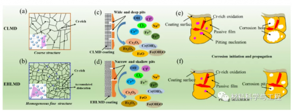 圖7(a) CLMD和(b) EHLMD涂層表面鈍化膜形成與破壞示意圖在這項(xiàng)工作中,研究了超高速激光沉積層和傳統(tǒng)激光沉積層技術(shù)制備的不銹鋼涂層的組織特征和耐腐蝕性能。超高速激光沉積涂層由于其較高的致密性、細(xì)化的晶粒和位錯(cuò)滑移與層錯(cuò)堆垛結(jié)構(gòu)的存在,在腐蝕溶液中形成了更加致密和穩(wěn)定的鈍化膜,表現(xiàn)出優(yōu)異的耐腐蝕性能。