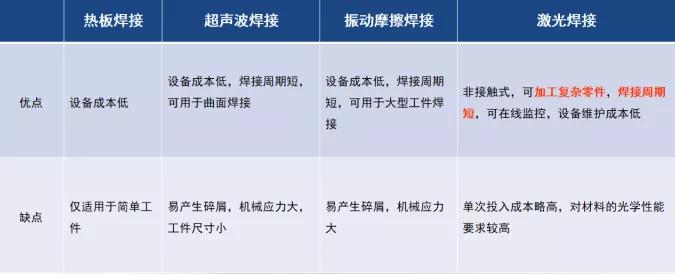 這四種焊接方式的優(yōu)缺點(diǎn)如下圖,其中塑料激光焊接的優(yōu)點(diǎn)尤為明顯,它可以加工復(fù)雜零件,且具有焊接周期短、可在線監(jiān)控、設(shè)備維護(hù)成本低的特點(diǎn)。