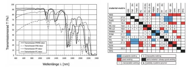 左圖是幾種透明塑料材料對(duì)波長(zhǎng)的透過(guò)率,可以看出在塑料材料對(duì)1200nm以下波長(zhǎng)的透過(guò)率都很高,對(duì)于1200nm以上波長(zhǎng)吸收率有所增加。一般說(shuō)來(lái),當(dāng)上層材料激光透過(guò)率高于50%,下層材料激光透過(guò)率低于20%時(shí),會(huì)獲得較好的激光焊接效果。右邊這個(gè)圖表為常用塑料材料的可焊性。