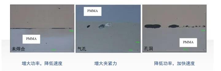 那么塑料焊接后會(huì)產(chǎn)生哪些缺陷呢?焊接缺陷一般包括未焊合、氣孔和孔洞,下圖是焊縫的縱截面形貌,左圖可以看到上下兩層材料中間有黑色未焊合區(qū)域,那么可以增加功率或降低焊接速度來(lái)避免這種缺陷,中間這幅圖可以看出存在氣孔,可以增加焊接夾緊力來(lái)消除缺陷;右圖黑色部位為焊接孔洞,這是能量密度高造成的,因此可以降低功率,增加焊接速度。
