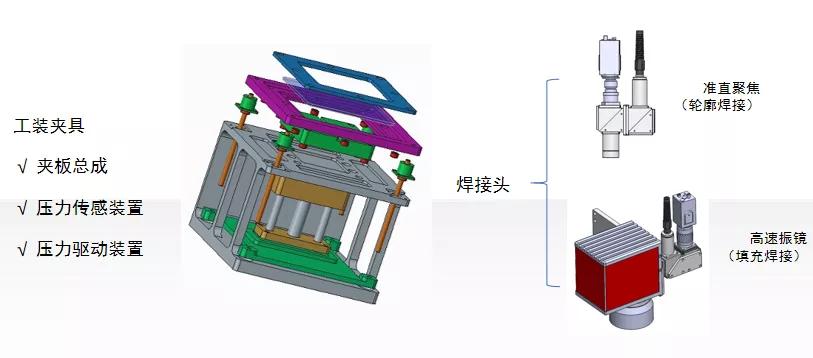 塑料焊接工裝夾具一般包括夾板總成、壓力傳感裝置以及壓力驅(qū)動(dòng)裝置。根據(jù)產(chǎn)品的結(jié)構(gòu)設(shè)計(jì)不同的工裝夾具,使用的焊接頭一般為準(zhǔn)直聚焦焊接頭和高速振鏡兩種,兩種焊接頭的典型適用范圍分別是掃描焊接和填充焊接。