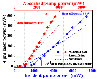 當使用 1966 nm 波長泵浦時,對應的 HBr 分子吸收最強的 R(3)吸收線,有最佳的輸出功率效果。圖 4展示了最佳氣壓 5 mbar下輸出的功率特性,在 4.2 μm 波段得到了最大 500 mW 的輸出功率,相對于吸收的泵浦功率的斜效率為 18%。與理論仿真的差異主要是由于實際氣壓小于氣壓計顯示的氣壓。