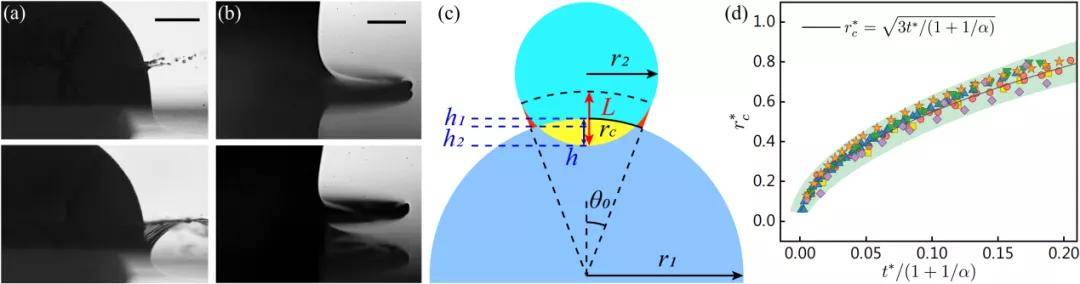 圖3. 小球入水和液滴撞擊中液膜早期鋪展的統(tǒng)一尺度律