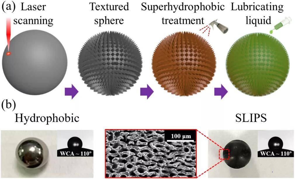 圖1. (a) SLIPS小球制備流程,(b)飛秒激光結構化小球表面掃描電鏡微觀形貌