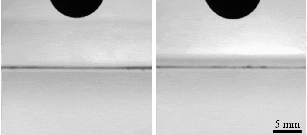 圖2. 疏水球入水(左)和 具有相同接觸角與撞擊速度的SLIPS小球入水(右)典型過程