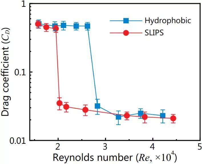 圖5. SLIPS小球可在更廣參數范圍內降低水下運動小球的阻力系數