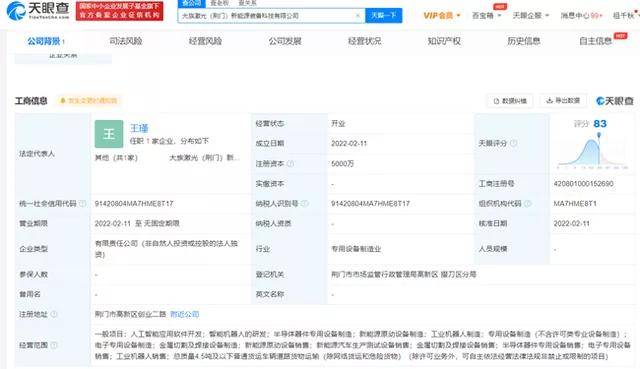 天眼查顯示,2月11日大族激光(荊門)新能源裝備科技有限公司成立,法定代表人為王瑾,注冊資本5000萬元。