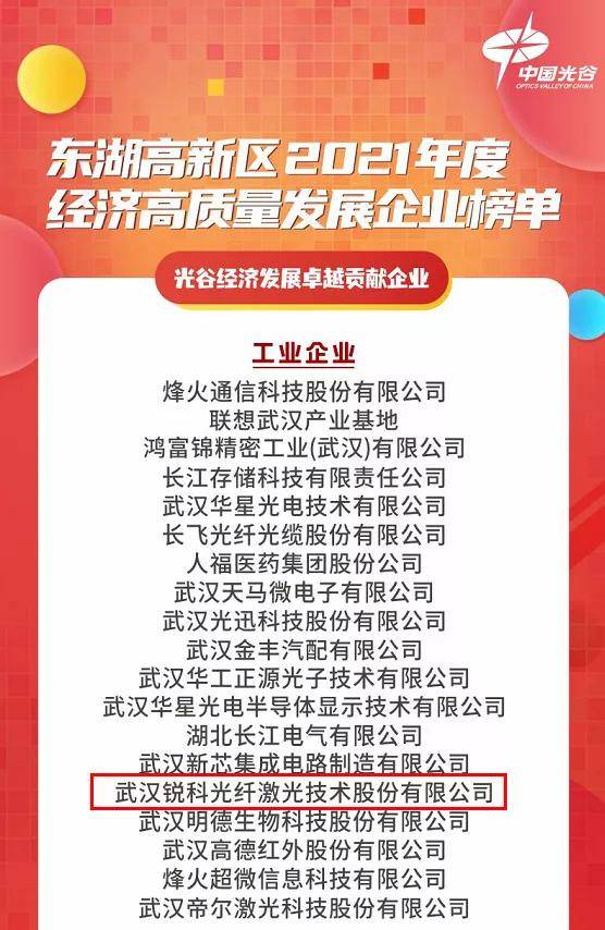 2022年1月16日上午,東湖新技術(shù)開發(fā)區(qū)管理委員會(huì)召開“2022年?yáng)|湖高新區(qū)工委(擴(kuò)大)會(huì)”,會(huì)議發(fā)布了《2021年度經(jīng)濟(jì)高質(zhì)量發(fā)展企業(yè)榜單》,帝爾激光和銳科激光上榜“20...
