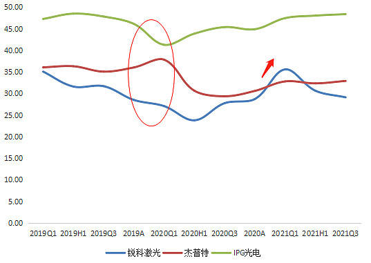 三家光纖激光器企業(yè)毛利率對(duì)比,來(lái)源:塔堅(jiān)研究
