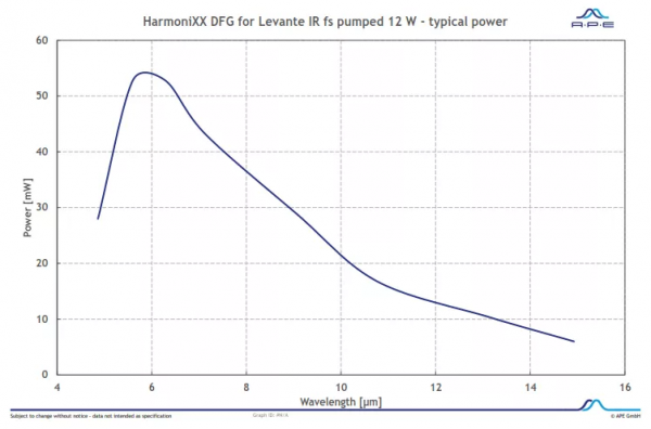 利用LeVante IR fs OPO的Signal和Idler光的調(diào)諧性能,APE公司的HarmoniXX DGF系統(tǒng)有非常好的調(diào)諧性能和效率,可以輸出4-15μm寬可調(diào)諧范圍,是顯微光學(xué),材料學(xué),電子學(xué)研究的理想光源!