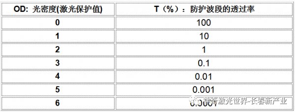 2、OD: 光密度(激光保護值),T:防護波段的透過率