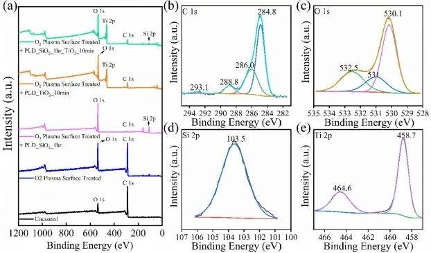 (a)未處理、氧等離子體表面處理PC、TiO2納米顆粒薄膜(S2)和SiO2/TiO2納米顆粒薄膜(S5)的XPS光譜比較;(b) (c) (d)和(e)是SiO2/TiO2薄膜(S5)的c 1s、O 1s、Si 2p和Ti 2p的高分辨率XPS譜。
