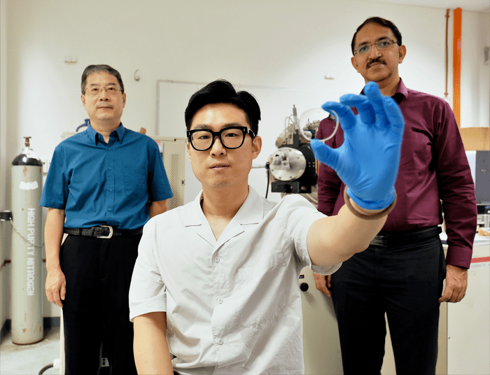 (L-R)NTU研究團隊包括材料科學(xué)與工程學(xué)院教授CHEN ZHONG,博士生SUN YE和國家教育學(xué)院自然科學(xué)與科學(xué)教育學(xué)術(shù)小組負(fù)責(zé)人RAJDEEP SINGH RAWAT教授。