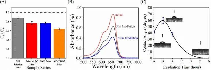 (A)亞甲基藍濃度(Ct/C0)在4種試驗條件下24小時紫外光照射后:僅MB、未涂層的原始PC、SiO2涂層和SiO2/TiO2涂層(S5)。相對濃度分別為0.88±0.02、0.77±0.03、0.77±0.02和0.64±0.02;(B)制備的S5樣品在初始、5小時和24小時輻照時間下的亞甲基藍溶液吸收光譜,以及(C)在用油酸沉積的SiO2/TiO2表面(S5)上的水接觸角隨UV輻射時間的變化。