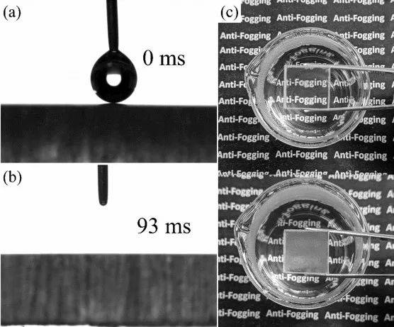 (a)和(b)S5表面5μL水滴的光學(xué)圖像,水在100毫秒內(nèi)的擴散行為(c)數(shù)字圖像,顯示暴露于熱蒸汽中的涂層(頂部)和未涂層(底部)PC的防霧性能。
