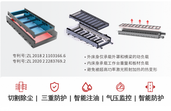 為保證切割的精度,從床身的基礎(chǔ)承載結(jié)構(gòu)出發(fā),創(chuàng)造性的中空+雙層分離式床身設(shè)計(jì),從設(shè)計(jì)上完全規(guī)避了精度被大負(fù)載和熱變形影響的可能,再次刷新了激光行業(yè)在床身穩(wěn)定性、保障精確性上的想象空間。