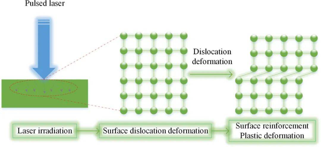 不同能量密度激光清洗下的飛機(jī)蒙皮表面顯微硬度值如圖17(a)所示,表面殘余應(yīng)力值如圖17(b)所示。如圖17(a)所示,激光清洗后蒙皮表面的顯微硬度普遍增加,表明脈沖激光使飛機(jī)蒙皮表面形成硬化層。從圖17(b)可以看出,激光清洗后飛機(jī)蒙皮表面存在顯著的殘余拉應(yīng)力,且隨著激光能量密度的增加而增加,表明脈沖激光導(dǎo)致蒙皮表面塑性變形。圖18是激光清洗過(guò)程中飛機(jī)蒙皮表面變化的示意圖。當(dāng)脈沖激光照射到飛機(jī)蒙皮表面時(shí),蒙皮表面的底漆層和覆鋁層吸收激光能量,振動(dòng)、破裂并蒸發(fā)。BMS10-11涂層的破裂導(dǎo)致產(chǎn)生的沖擊波作用于蒙皮表面,在蒙皮表面形成致密穩(wěn)定的位錯(cuò)結(jié)構(gòu),從而使蒙皮表面硬化。同時(shí),蒙皮表面的殘余應(yīng)力被釋放和重新分布,導(dǎo)致塑性變形。綜上所述,激光清洗可以提高飛機(jī)蒙皮表面的硬度,產(chǎn)生影響部件穩(wěn)定性的殘余拉應(yīng)力,這是目前工程部門(mén)需要解決的問(wèn)題。
