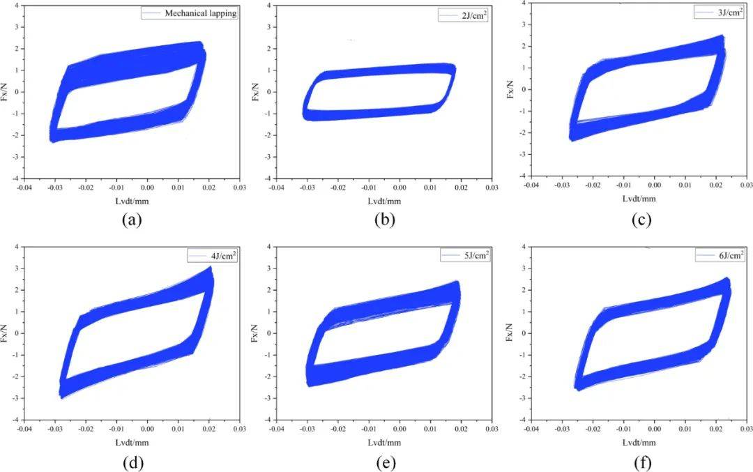 對(duì)不同能量密度激光清洗的飛機(jī)蒙皮鉚釘孔進(jìn)行了微動(dòng)摩擦磨損試驗(yàn),并與傳統(tǒng)的機(jī)械清洗方法進(jìn)行了比較。每個(gè)樣品表面的磨痕形態(tài)如圖13所示,微動(dòng)行為區(qū)域如圖14所示。從圖13(a-f)可以看出,蒙皮表面的接觸壓力導(dǎo)致蒙皮的塑性變形和粘附,并且磨損碎屑不容易去除,從而加速了微動(dòng)磨損過(guò)程。當(dāng)振動(dòng)足夠大時(shí),微動(dòng)磨損將成為疲勞裂紋的核心,導(dǎo)致疲勞斷裂。在圖14(a-f)中,微動(dòng)行為曲線為平行四邊形,表明整個(gè)微動(dòng)磨損中存在滑移區(qū)。在行為曲線的傾斜部分,摩擦副與蒙皮表面之間的靜摩擦發(fā)生局部滑動(dòng)。隨著滑移量的增加,摩擦力大于靜摩擦力,相對(duì)運(yùn)動(dòng)趨于穩(wěn)定。