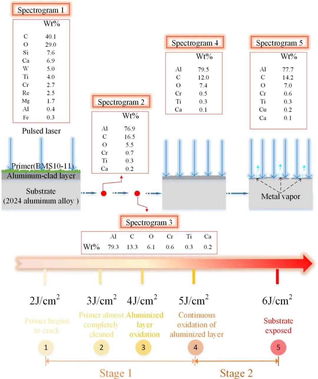對(duì)所有清洗過(guò)的樣品進(jìn)行EDS分析,結(jié)果如圖9所示。在2 J/cm2時(shí),BMS10-11底漆層吸收激光能量后開(kāi)始開(kāi)裂,氧含量迅速上升。其中Si、Ca、W、Cl等在高溫下易氧化,形成氧化物并從蒙皮表面脫落。在3 J/ cm2時(shí),漆層中Si、Ca、W、Re、Mg、Fe等元素消失。大部分涂料層已被去除,鋁含量從0.4%迅速增加到76.9%,蒙皮開(kāi)始暴露鋁層(圖6(c))。此時(shí),蒙皮表面的氧氣處于低狀態(tài)。隨著激光能量密度的增加,在4 J/ cm2時(shí),Al含量繼續(xù)上升至79.3%,蒙皮表面的油漆層幾乎被去除。鋁包層開(kāi)始熱氧化,導(dǎo)致蒙皮表面產(chǎn)生波浪。5 J/cm2時(shí),Al含量最高,達(dá)到79.5%。鋁包層繼續(xù)被熱氧化,之前被氧化過(guò)的部位被重新熔化,使蒙皮表面顯得比較平整,可以認(rèn)為是最好的清潔狀態(tài)。
