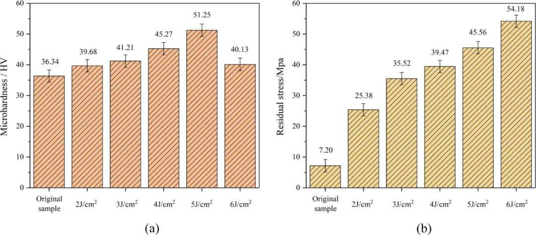 圖17 (a)不同能量密度激光清洗飛機(jī)蒙皮表面的顯微硬度值;(b)不同能量密度激光清洗下飛機(jī)蒙皮的表面殘余應(yīng)力值。