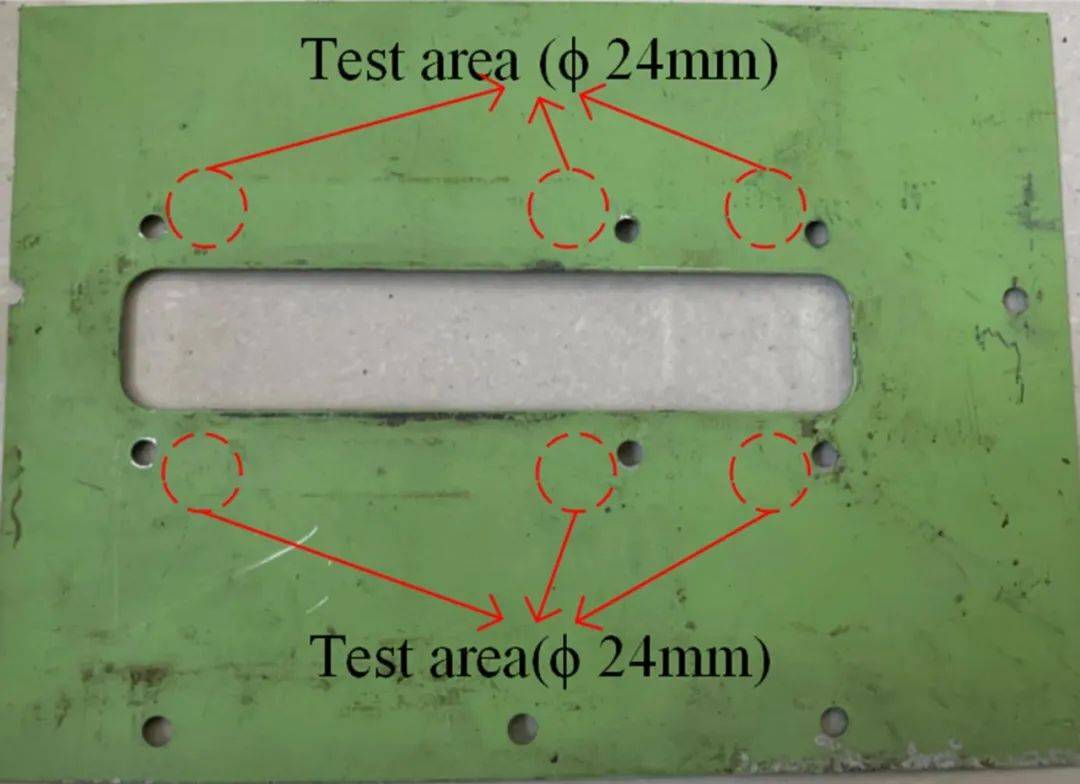 采用MFT-50 RTEC摩擦磨損試驗(yàn)機(jī)(San-Jose, CA, USA)研究激光清洗后飛機(jī)蒙皮的摩擦磨損性能。摩擦磨損試驗(yàn)示意圖如圖3所示。摩擦是球和板之間的干往復(fù)摩擦。GCr15軸承鋼球(Ra<0.1μm),直徑為6.35 mm,硬度為HV750。加載力為10 N,磨損時(shí)間為30 min,位移幅值為4.5 mm,運(yùn)行頻率為2 Hz。采用RTEC微動(dòng)摩擦磨損試驗(yàn)機(jī)(MFT-2000, San-Jose, CA, USA)研究了激光清洗后飛機(jī)蒙皮鉚釘孔周圍的微動(dòng)摩擦磨損性能。微動(dòng)摩擦磨損試驗(yàn)示意圖如圖3所示,微動(dòng)磨損試驗(yàn)區(qū)域如圖4所示。同樣,摩擦法為室溫下干往復(fù)摩擦法。GCr15軸承鋼球(Ra <0.1μm),直徑為9.525 mm,硬度為HV750。載荷為10 N,磨損時(shí)間為30 min,位移幅值為50 μm,運(yùn)行頻率為2 Hz。在進(jìn)行摩擦磨損實(shí)驗(yàn)后,利用MFT-4000白光干涉儀(蘭州華輝儀器科技有限公司)采集磨損形貌,測(cè)量磨損體積和摩擦系數(shù)。
