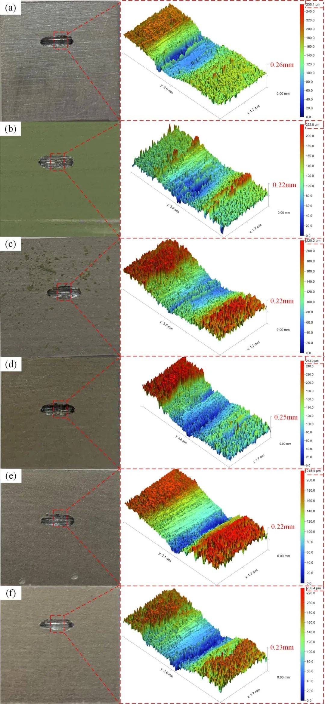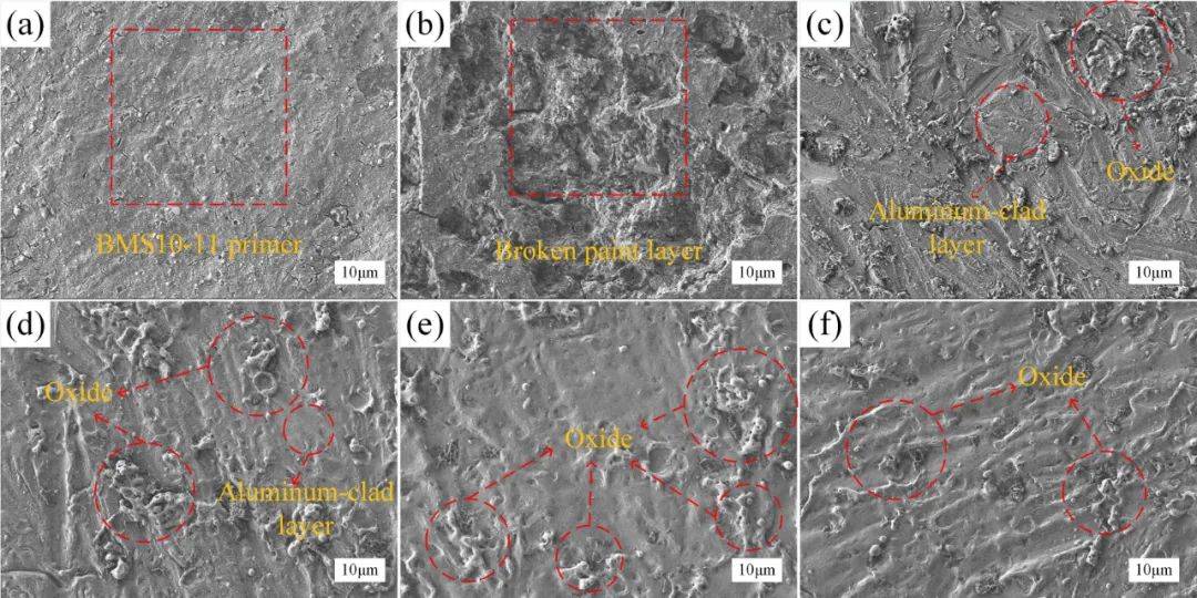 結(jié)合圖13(a)和(b-f),我們可以看到,機(jī)械研磨后蒙皮表面的磨痕小于激光清潔后的磨痕,因?yàn)闄C(jī)械研磨提高了蒙皮表面的硬度,使磨痕變淺。當(dāng)能量密度為6J/cm2時(shí),蒙皮表面的覆鋁層在高能激光照射下繼續(xù)被熱氧化和汽化,導(dǎo)致覆鋁層開(kāi)裂。蒙皮表面的摩擦系數(shù)再次上升至0.7381,磨損量也顯著增加。