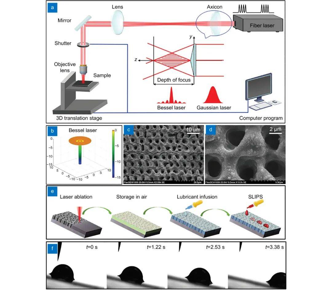 2020年,Cheng等人[3]通過對(duì)飛秒激光進(jìn)行時(shí)間整形和空間整形,在空氣環(huán)境中利用飛秒激光在金屬鎳鈦合金表面制備出仿生超滑表面(圖3)。在時(shí)間域上通過外觸發(fā)脈沖波選頻的方式,實(shí)現(xiàn)一定頻率的脈沖串輸出,在空間域上利用錐透鏡將飛秒激光光場從高斯分布轉(zhuǎn)換為貝塞爾分布,最終在空氣環(huán)境下直接在鎳鈦合金表面構(gòu)建出具有高深徑比的微納多孔結(jié)構(gòu)。隨后通過空氣放置來吸收空氣中的烴基實(shí)現(xiàn)自身的低表面能化,進(jìn)一步的醫(yī)用級(jí)全氟萘烷灌注實(shí)現(xiàn)了鎳鈦合金超滑表面的制備。這種超滑表面的制備不僅效率高,可以實(shí)現(xiàn)大面積樣品加工,而且沒有使用化學(xué)處理,真正做到安全環(huán)保。