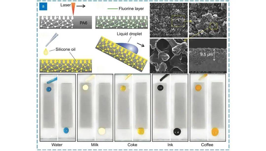 2017年,Yong等人[2]率先利用飛秒激光直寫技術(shù)在聚酰胺(PA6)表面制備出超滑表面,如圖2所示,激光掃描過后的PA6表面分布著厚度約為10 μm、直徑1 μm的三維網(wǎng)狀多孔結(jié)構(gòu)。在激光燒蝕過程中,多光子的非線性吸收使得表面瞬時(shí)產(chǎn)生高溫高壓的等離子體,與此同時(shí)產(chǎn)生的大量氣體會(huì)不斷溢出,熔融物在氣體溢出時(shí)重新固化,生成三維網(wǎng)狀多孔結(jié)構(gòu)。經(jīng)過后續(xù)的氟化處理以及硅油灌注,形成的超滑表面不僅對(duì)低表面張力的十六烷(表面張力 = 27.5 mN/m)具有疏液性,還對(duì)各種混合液如咖啡牛奶、蛋黃等具有良好的疏液特性。該方法不僅可應(yīng)用于PA6,還同樣可應(yīng)用于PMMA(聚甲基丙烯酸甲酯,俗稱亞克力)、PA(聚酰胺,俗稱尼龍)等高分子材料。