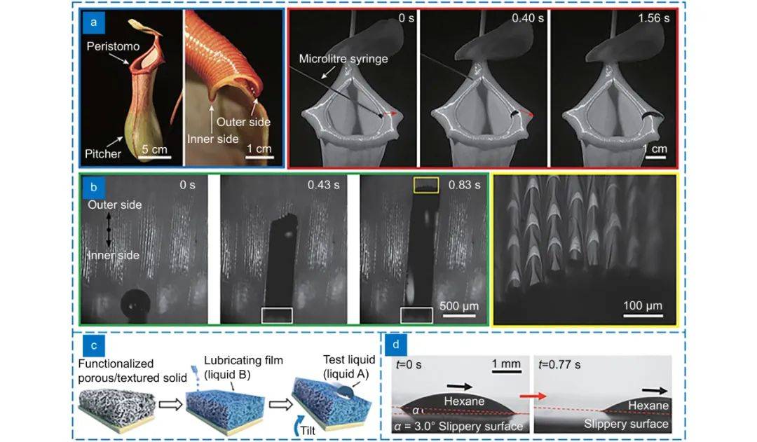 2011年,Wong等人[1]首次報(bào)道了仿豬籠草的液體灌注多孔超滑表面,通過在材料表面構(gòu)建一層多孔網(wǎng)狀結(jié)構(gòu),注入潤滑液,潤滑液會(huì)存儲(chǔ)在多孔網(wǎng)狀結(jié)構(gòu)內(nèi)部,并在表面形成一層潤滑層,最終通過這層潤滑層來提升材料的疏液性。圖1為豬籠草表面結(jié)構(gòu)及其超滑性能。