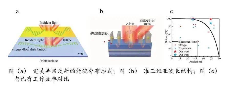 針對上述問題,研究團隊從完美異常反射的物理要求出發(fā),首先闡明了完美異常反射所需要的能流分布形式,提出了一維多層膜結(jié)合二維超表面的準三維亞波長新結(jié)構(gòu),通過準三維結(jié)構(gòu)內(nèi)傳輸波和布洛赫波的高效耦合,增強了多重散射并提高了非局域能流調(diào)控能力,在1550納米實現(xiàn)了國際上效率最高的、效率優(yōu)于99%的光頻異常反射。