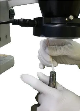 ②.把棉簽或擦拭紙放在石英柱端面上, 移動棉簽或擦拭紙,直到石英柱膜面干凈。當石英柱通光面大面積被污染時,應先用棉簽沾酒精初步清潔一遍,用力盡可能輕,防止造成膜層劃傷;將較大顆粒的臟污去除后,再細擦局部。細擦石英柱通光面,棉棒潔凈,擦拭時應從同一方向逐步擦拭,防止交叉污染,注意細擦時酒精量不可過多,以免產生印跡殘留。
