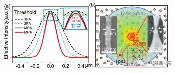 研究人員利用飛秒激光與物質(zhì)的非線性相互作用,通過多光子吸收引起的“雪崩電離”效應(yīng),實現(xiàn)了HSQ的飛秒激光超衍射納米光刻,突破了前人提出的HSQ無法使用可見和近紅外光進行光刻微加工的局限。首先,通過精確控制激光焦點處的光場分布,研究了閾值效應(yīng)對飛秒激光超衍射納米光刻技術(shù)加工的HSQ微結(jié)構(gòu)特征尺寸的影響規(guī)律。隨著HSQ同時吸收光子數(shù)的增加,有效光強分布曲線變得越來越窄,同時越來越陡峭。當(dāng)飛秒激光的能量逐漸逼近閾值能量時,會得到具有極小特征尺寸的HSQ結(jié)構(gòu)。