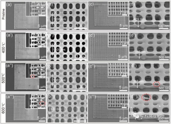 圖2.飛秒激光直寫的3D HSQ雙層線條陣列結(jié)構(gòu)的耐熱性研究