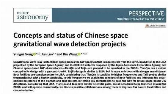 2021年9月,華中科技大學(xué)天琴引力波理論團隊在國際最權(quán)威天文刊物之一——《自然》(Nature)雜志子刊《自然-天文》(Nature Astronomy)上刊文,向國際學(xué)界發(fā)出中國聲音,全方位地介紹中國的“天琴”及其中國空間引力波探測計劃的成就,這也是中國科學(xué)家首次在頂尖國際雜志對該計劃做完整系統(tǒng)的介紹。