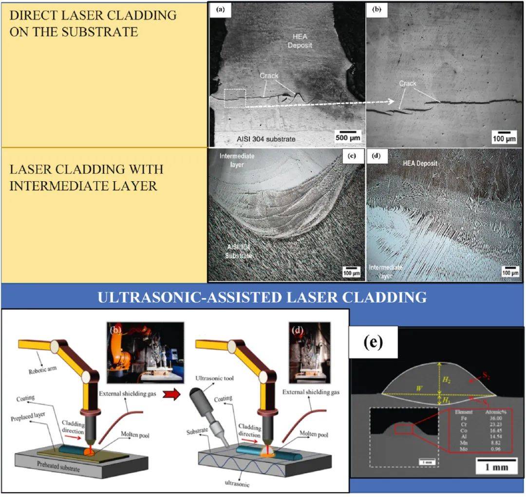 圖16 SEM觀察了alfenicocr基LC-HEACs的截面及中間層對(duì)其顯微組織的影響;(a、b)界面區(qū)成分失配引起的裂紋形貌圖;(c, d)界面結(jié)合良好的枝晶形貌。此外,引入CoNiFe2作為中間層后,由于復(fù)合材料具有更好的混溶性和溶解度,沒(méi)有出現(xiàn)裂紋;(e)預(yù)熱基底和超聲輔助激光熔覆設(shè)備圖,超聲系統(tǒng)以20kHz的頻率振動(dòng),SEM顯微圖顯示良好的冶金結(jié)合,無(wú)微裂紋和氣孔。它還減輕了殘余應(yīng)力。