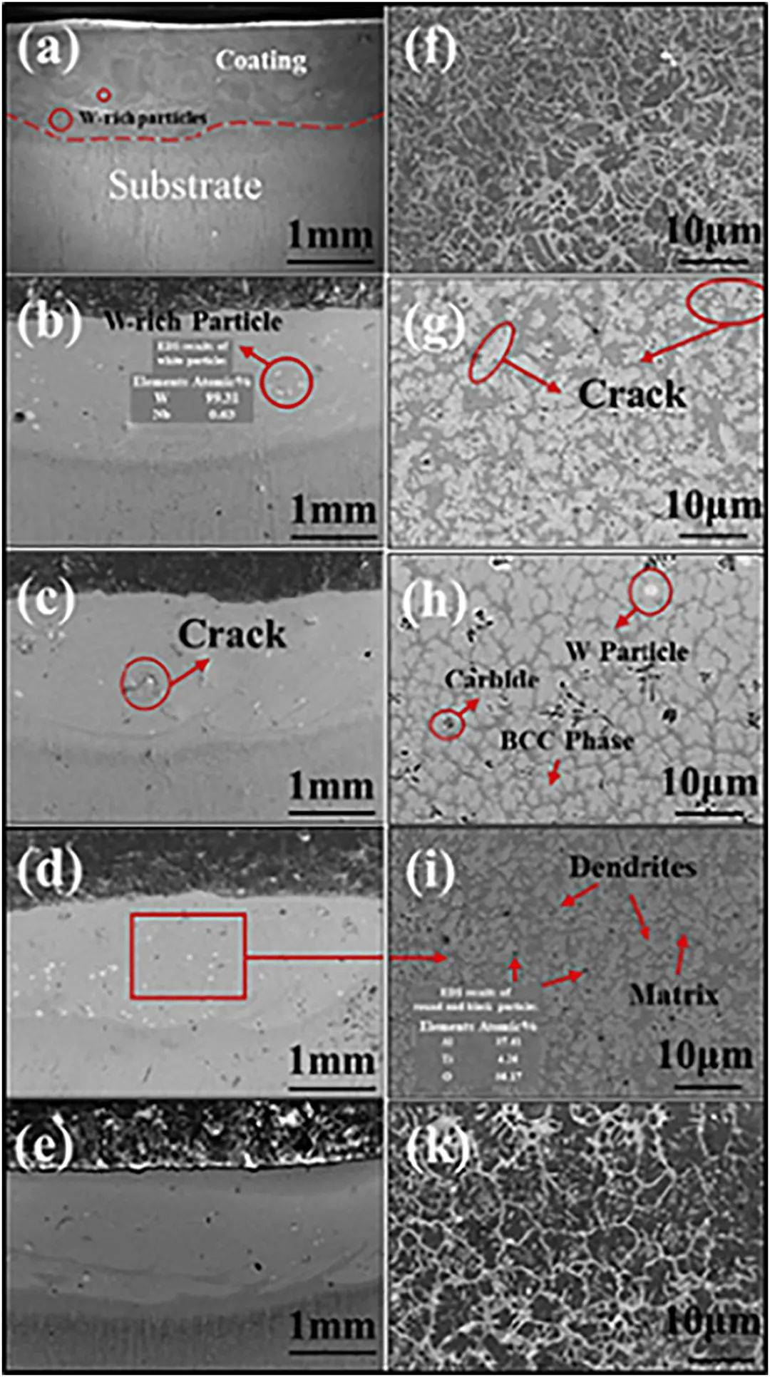 圖14 不同激光功率下制備的AlMoFeCrTiWNb材料的SEM顯微形貌;(a, f)在最低激光功率為2.4kW時(shí),晶界處形成了具有析出相的典型不規(guī)則枝晶組織;(b, g)白色表示在較低的激光功率2.6kW下的W未熔化粒子。由于晶格畸變,熔覆層中存在少量微裂紋;(c, h)當(dāng)激光能量密度為2.8kW時(shí),不規(guī)則組織向規(guī)則枝晶組織轉(zhuǎn)變,碳化物晶粒尺寸增大;(d, i)在3kW時(shí),包層未發(fā)現(xiàn)微裂紋。然而,毛孔仍然很少;(e, k)白色粒子在3.2kW時(shí)消失,因?yàn)楦呒す馐芰客耆诨烁粀粒子。