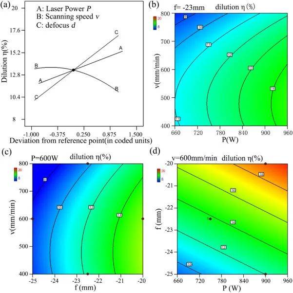 激光熔覆工藝參數(shù)對(duì)稀釋度的影響:(a)工藝參數(shù)攝動(dòng)圖;(b) P, v等高線圖;f (c), v;(d) P f。