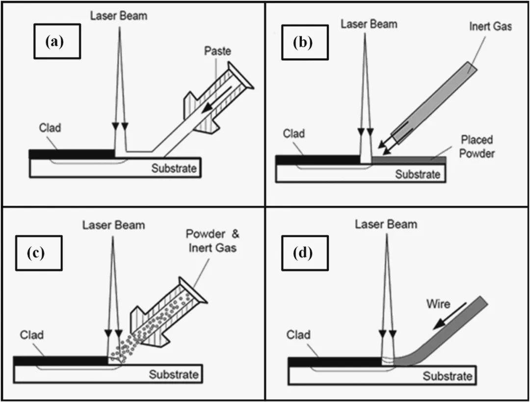 圖 12.不同類型的粉末進(jìn)料系統(tǒng);(a)需要激光沉積漿料的熔融技術(shù);(b)采用預(yù)先放置的粉末進(jìn)行激光沉積的重熔技術(shù);(c) 在激光作用期間通過(guò)噴嘴輸送粉末的粉末噴射技術(shù);(d)需要以鋼絲為原料的送絲技術(shù)