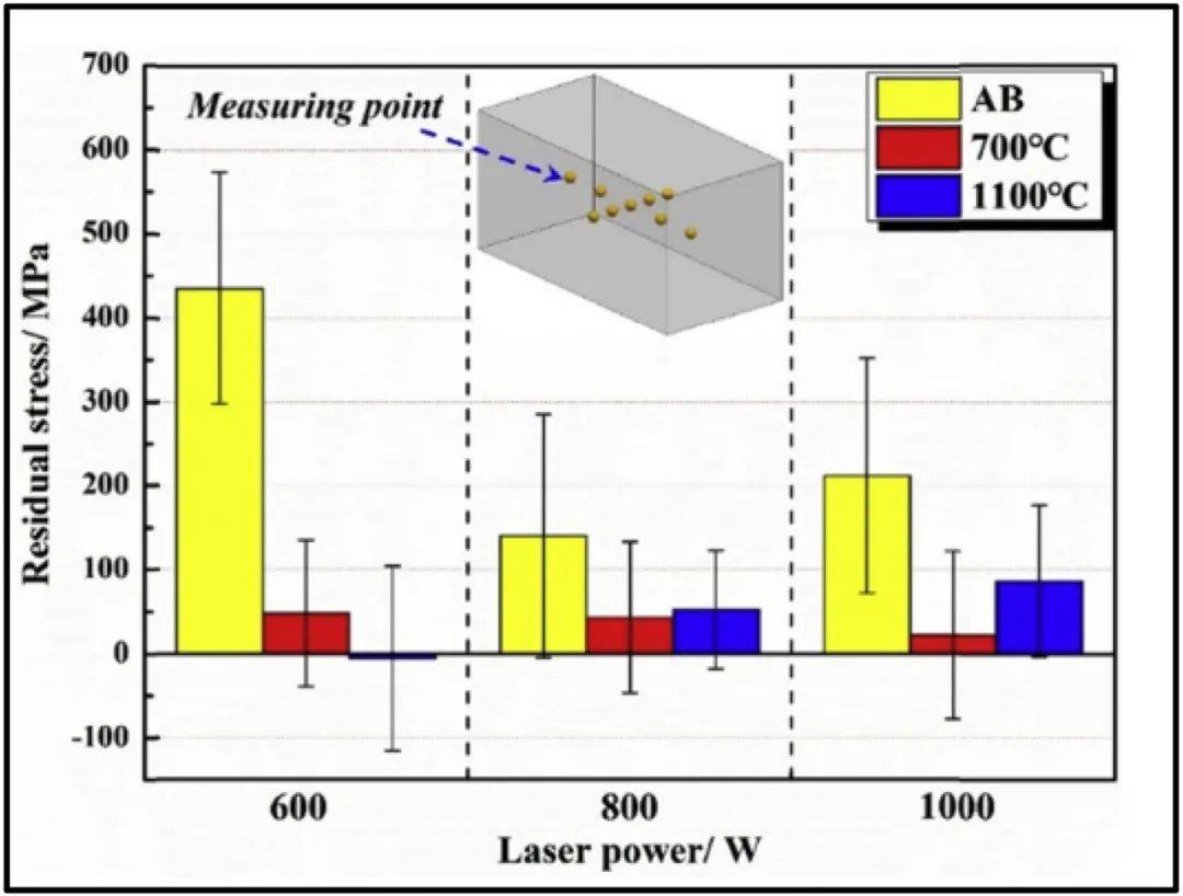 圖17 圖為在不同激光功率下,700°C和1100°C試件的實(shí)測(cè)殘余應(yīng)力。殘余應(yīng)力隨加熱時(shí)間的延長(zhǎng)而降低。由于淬火速率高,激光功率越低,殘余應(yīng)力越大。此外,固化包層收縮體積的減弱增加了殘余應(yīng)力,為1kW。